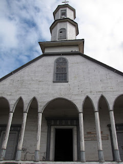 With so much to see on this island and only one more day to do it, we decided again to rent a car and venture out on our own. We joined up with an Australian girl named Katy that we had met in our hostel and hit the road. First up was a drive and ferry ride to another small island off of this island, called Achao. We went in search of a few things: seafood in the form of fresh oysters served right on the beach, mussels for dinner later that evening, and churches. For a small island of only 160,000 inhabitants, there are 150 churches, many of which are Unesco World Heritage sites. Most are entirely made of wood and constructed such that they did not even use any nails to hold them together.